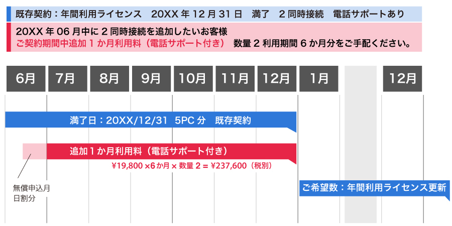 追加1か月利用料は、月額課金ではありません。追加の際は既存契約期間までのライセンスを購入する必要があります。